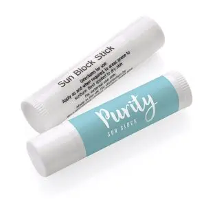 Another handy giveaway, this white 4.8g total sun block in a stick, is perfect for the places that get burnt first. White twist-up stick container with short white cap.