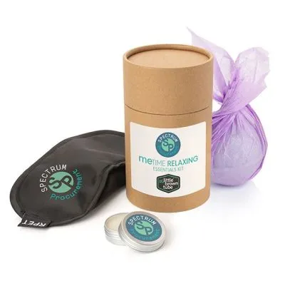 Also available in white cardboard, these little tubes come with a branded label and a selection of pamper items like sleep balm, sleep mask and bath bombs. You can pick and choose which items to have, (there is a huge range including roll on pulse point and natural relaxing foam bath) and whether you want the items branded with your logo or not. You can also choose to have these toiletries in a branded reusable tin, hemp or cotton bag or a spa-style toiletry bag.