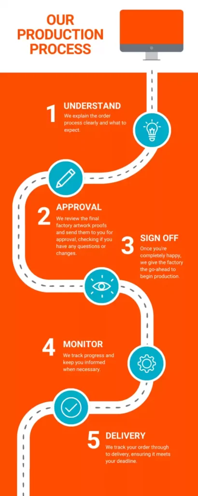 Once we have your artwork in the right format and have been given your go ahead, we will produce visuals (also known as mock ups) of your design. These visuals will be complete with your branding and any extra information you want to include. This is called the artwork proofing process. It is the first and essential step for us to ensure you are completely happy with how everything looks before we go on to produce your branded products. Once you have approved your visual, we will then inform the manufacturers to commence producing your items.