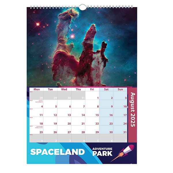 A3 portrait wall calendar Wiro bound with hanger loop Standard library images or fully bespoke design option 14 sheets (including protective cover) plus grey board backing Produced using certified responsibly sourced materials Supplied inserted into white board mailing envelopes
