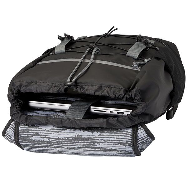 Features a spacious 15” laptop compartment with a drawstring cord Adjustable buckles