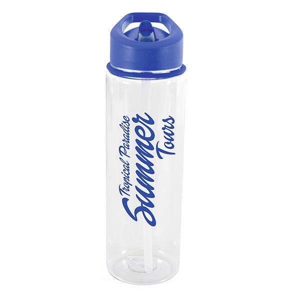 Aqueous straight clear sports bottle Capacity: 725ml Straight sided clear bottle with coloured cap and trim Integral straw and hinged mouthpiece