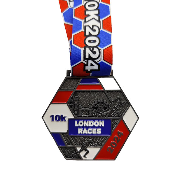 Fully bespoke size and shape, die-cast zinc alloy, ribbon/lanyard attachment; up to 4 infilled enamel colours are included in the quoted price.