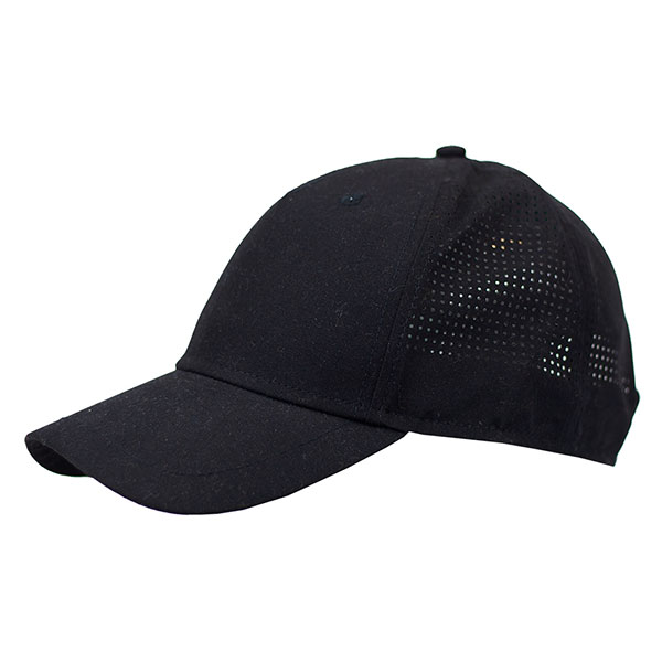 570 mm crown, lightweight polyester construction, laser-cut air holes on side and rear panels, and a Velcro adjuster.