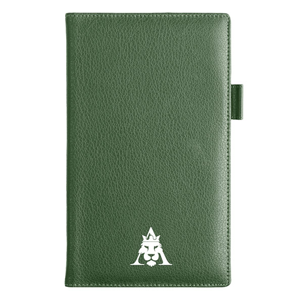 Perimeter-stitched soft grained leather with a pen loop and card pockets; wipe clean with a damp cloth and avoid prolonged exposure to moisture or heat.