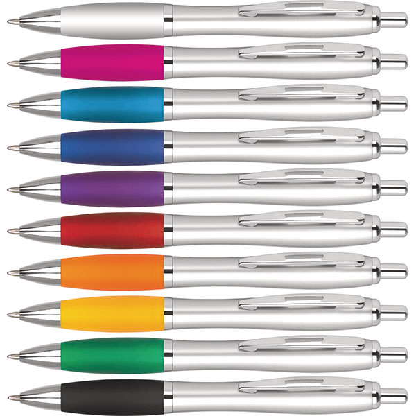 Printed 1 colour on the barrel (black ink by default); button-action mechanism and coloured soft rubber grip matchable to barrel colours.