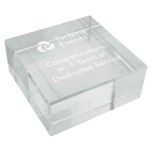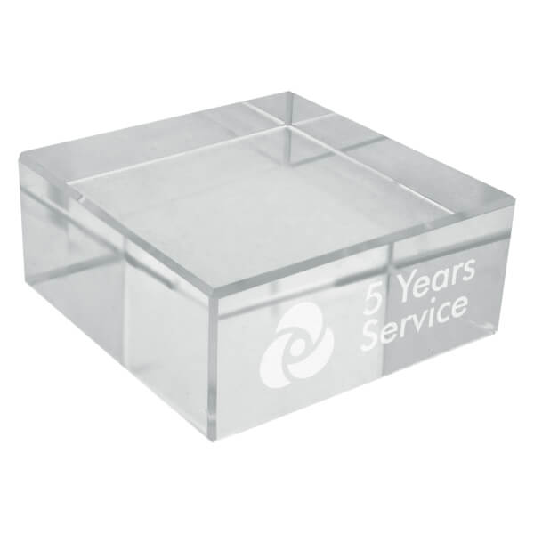 A contemporary 69mm square heavyweight desk crystal block paperweight.