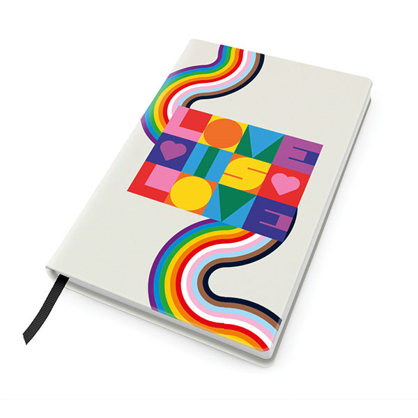 Full-colour print to the whole cover (wraparound) as standard; coloured elastic and ribbon marker included.