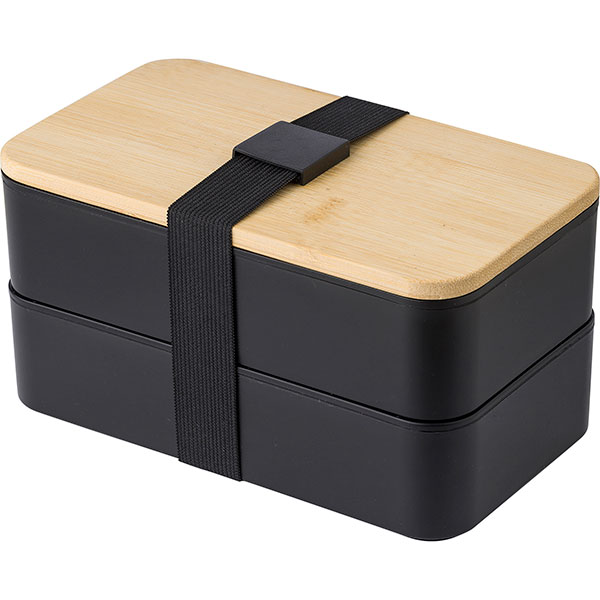 Dimensions 185 x 105 x 95 mm; bamboo lid with elastic strap and a plastic knife, fork and spoon included.