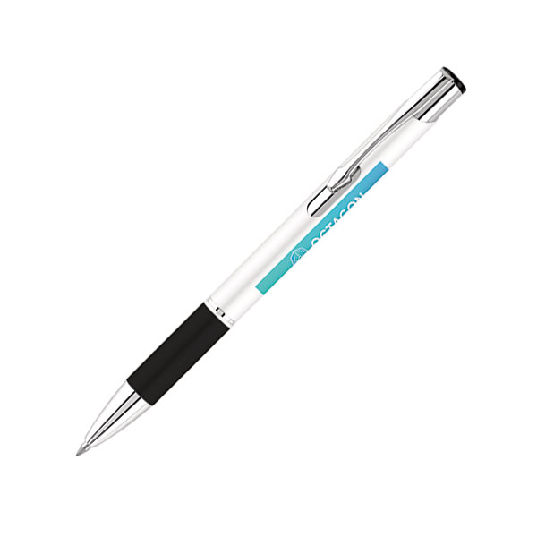 Pen length 137 mm; satin finish coloured barrel, black rubberised grip, chrome trim, black ink.