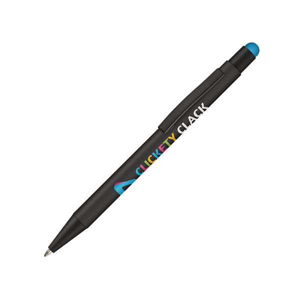 Length: 141 mm; soft-touch rubberised barrel; push action with stylus tip; ink colour: black.