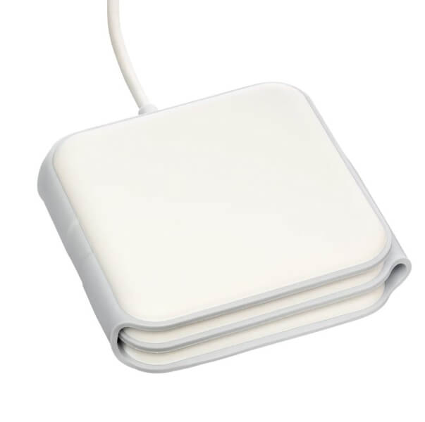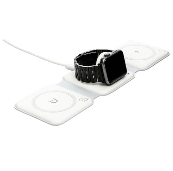 The soft silicone material between charging pads allows the charger to be effortlessly folded for space-saving storage.A magnet ensures it remains securely folded.