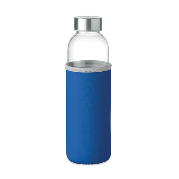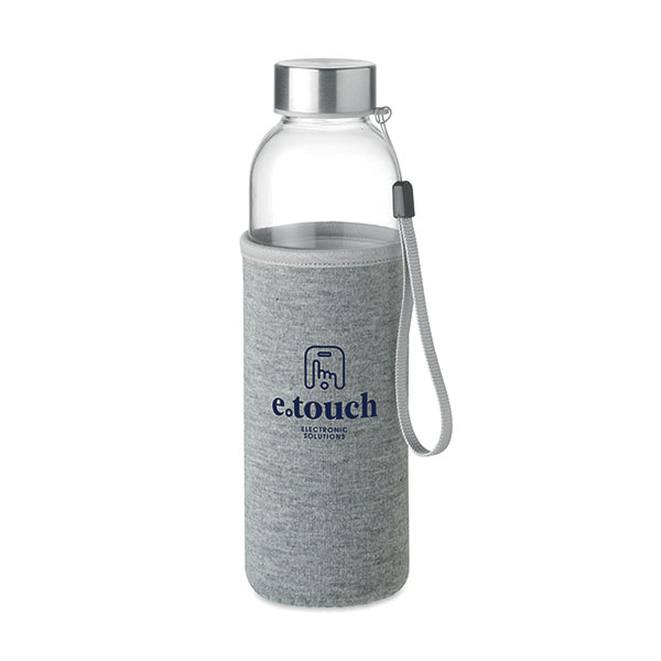 The neoprene pouch provides thermal protection and grip, with a grey fabric handle strap for easy carrying and branded presentation.