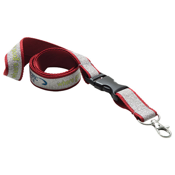 Overall dimensions: 900 x 20 mm; 20 mm polyester with glitter on one side; includes plastic safety break and metal trigger clip.