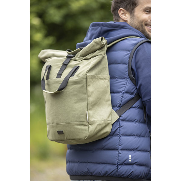 Features zipped roll-top main compartment, zipped front pocket, 2 side water bottle pockets, reinforced webbing carry handles and padded shoulder straps for everyday use and gifting.