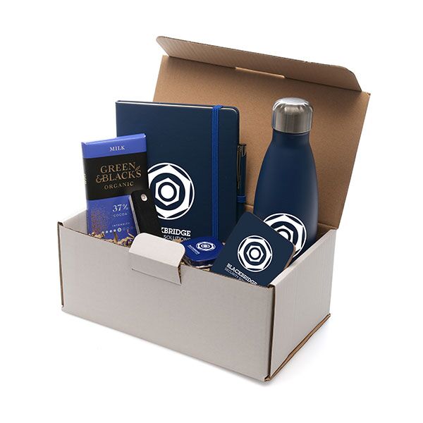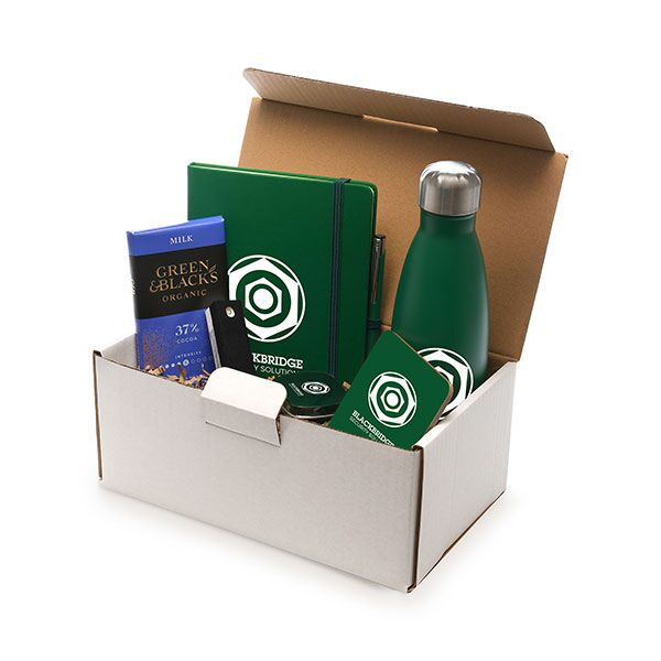 Mail box – premium corporate gift pack Containing: Presentation Box – (the box is personalised with a full colour A6 label on the lid of the box Mole Mate notebook printed 1 colour on the front Mole Mate pen engraved Ashford bottle printed 1 colour Coaster digitally printed on the front Phone screen cleaner printed 1 colour 1 position Mint tin printed 1 colour in 1 position Box of Maltesers