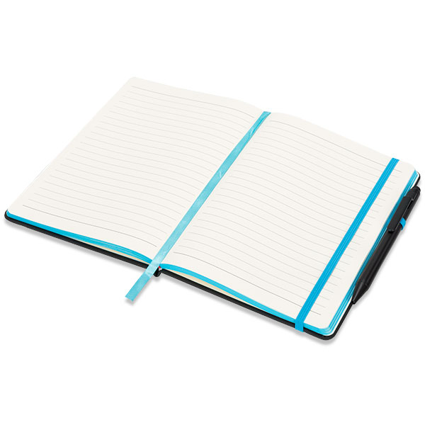 Multi-coloured options with coloured edging, matching page marker, pen loop and closure band.