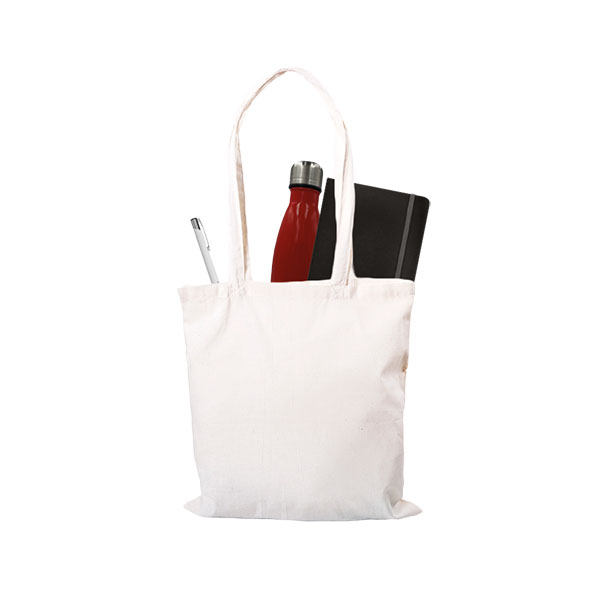 Bag 400 x 360mm (5 oz cotton shopper); bottle 265 x 70mm (500ml double-walled stainless steel); notebook 210 x 145mm (100 cream lined sheets); ballpen 139mm long.