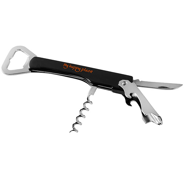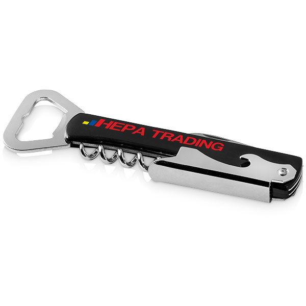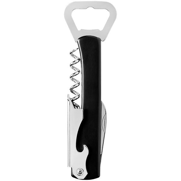 Dimensions 135 x 40 mm; includes bottle opener, corkscrew and foil cutter.