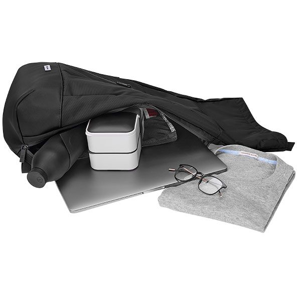 Moleskine Metro roll top backpack Capacity: 30 litres Roll top main compartment opening Adjustable belt and flat buckle closure Side coated zip pocket Front pocket with heat sealed zipper closure Sternum strap with adjustable length and height Emergency whistle Secure zip pocket on side of laptop compartment My Moleskine notes pocket Inner padded compartment Embossed honeycomb interior lining with reflective details Adjustable padded shoulder straps Breathable air-mesh back Luggage trolley strap