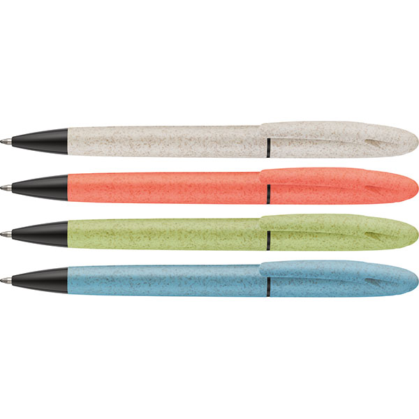 Barrel colours: Blue, Green, Multi Coloured, Pink, Yellow. Ink: black ballpen; highlighter: yellow.