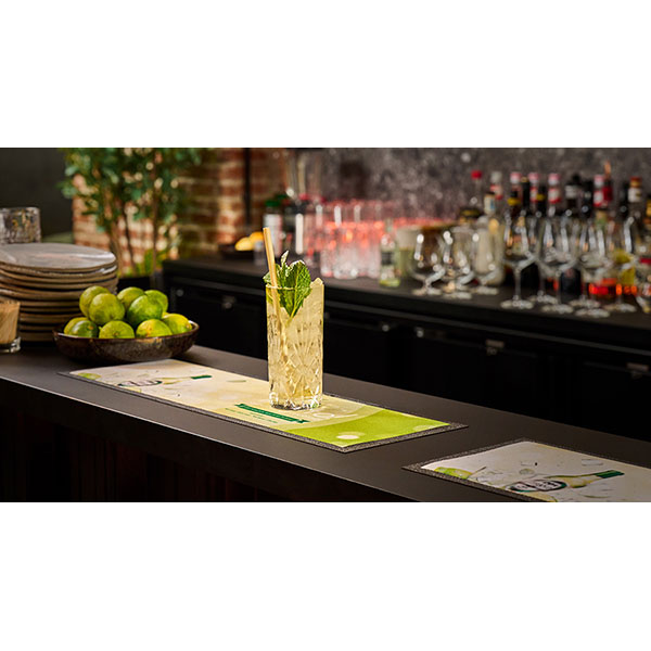 Durable knitted polyester surface for spill resistance and a rubber underlay for non-slip performance in busy bar environments.