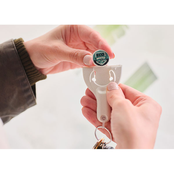Dimensions 74 x 52mm; pocket-sized ice scraper and trolley coin insert; 100% recycled material.