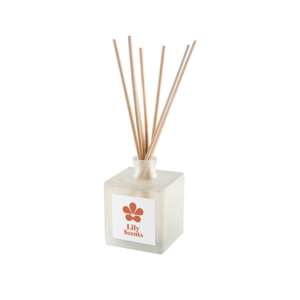 Glass bottle with lid and 6 reeds; dimensions 90 x 55 x 55 mm.