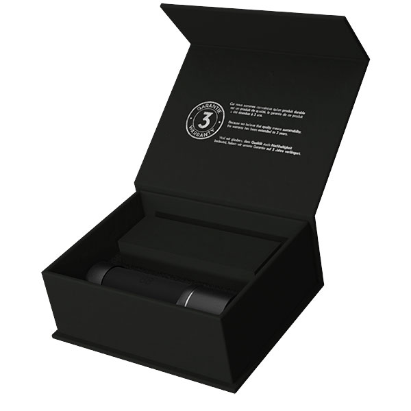 Dimensions 97 x 33 mm; includes cylindrical metal charging base and three ear tip sizes (small, medium, large).