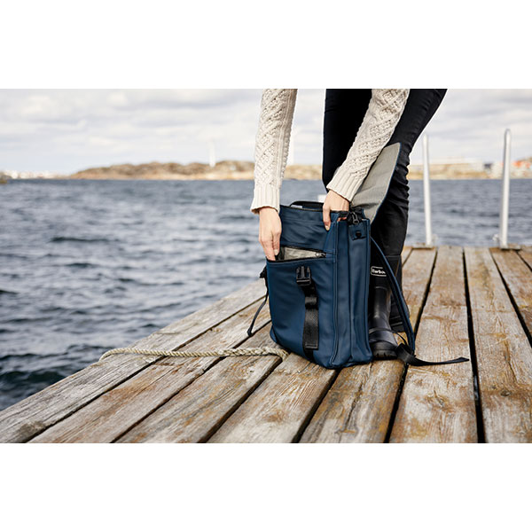 Made from water-repellent PU, it has a hidden rear zipped pocket, front zipped compartment, padded adjustable shoulder straps and a padded laptop sleeve.
