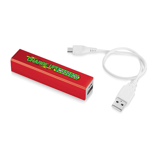 2200 mAh capacity, 1A output, supplied with micro USB cable, charge indicator light (turns blue when fully charged); dimensions 93 x 22 x 21 mm.